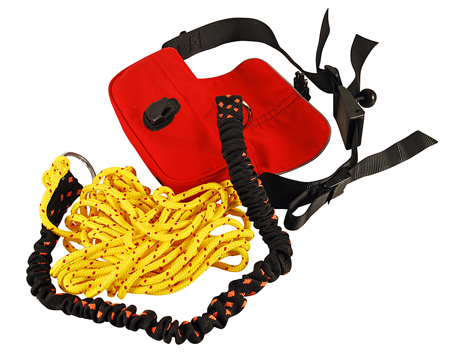 Tow line neatly packed away in a bag attached to a safety harness with a quick releasing buckle. 10m floating rope is attached first to a webbing tube tow line with elastic insert (cow tail), then to the safety harness.The safety harness also features a clip for carabiner on its side.