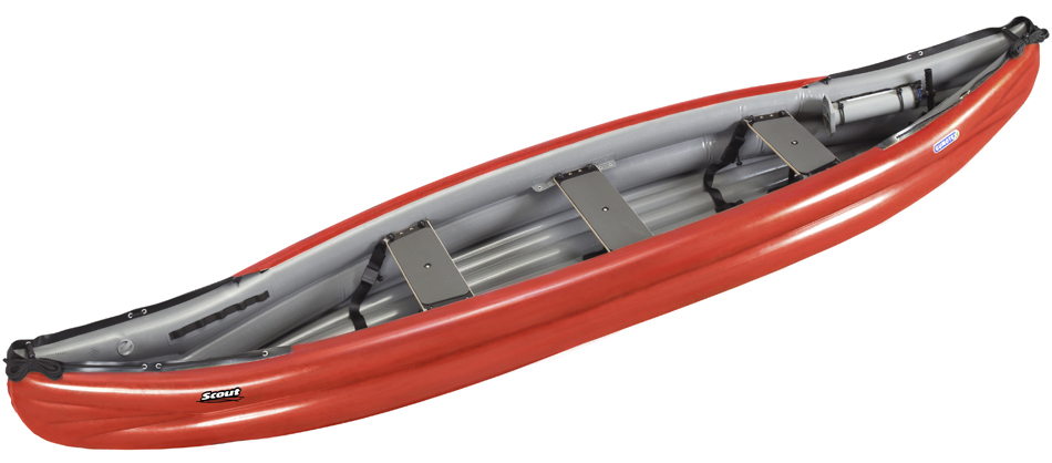 SCOUT EX is an Expediton canoe fitted with a self-bailing floor and an unique system of stiffeners T-bones that are fitted between each seat and the floor. T-bones system provides the canoe with an extraordinary rigidity, so it paddles like a hard shell canoe.